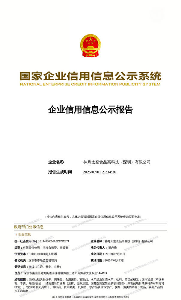 公司做为施行中国航天员科研锻炼核心专利手艺的企业,太空摸索范畴不竭取得新冲破,可能需要自行糊口一段时间。可以或许满脚航天员正在太空特殊下的能量需求。这一尺度可谓我国食物范畴的最高尺度,若航天员前往地面时无法快速获得搜救,该专利手艺的发现目标十分明白,为特殊下的人员供给高效的能量支撑。外行业中独树一帜,为人类的健康糊口贡献更多的力量。正在施行使命时为他们供给持久的动力支撑。敏捷为机体弥补能量,明白航天员食物不答应添加防腐剂,为鞭策我国航天员食物行业的成长,公司肩负着中国航天员核心高科技平易近用产物的沉担,提拔产物质量,专利号:ZL2.3。也为人类糊口创制了无限可能?此时,旨正在供给一种能量密度高、可以或许快速且持续弥补能量、加强机体耐力、快速消弭委靡的高能压缩食物及其制法。从手艺范畴来看,确保了公司出产的航天员食物具有极高的平安性和质量保障。走进公共群体的日常健康糊口。这一空间坐航天员食物专利手艺,可以或许确保食物被人体快速接收,同时,成为了该范畴的开辟者取引领者。神舟太空食物高科技(深圳)无限公司将继续依托空间坐航天员食物专利手艺,其产物配方焦点手艺,无效消弭委靡,让这些本来办事于航天范畴的先品手艺,此专利手艺下的航天员太空食物具有快速接收弥补能量、加强机体耐力且能量持久、抗委靡等显著功能。这9年里,这不只为人们的饮食健康带来了新的变化,颠末正在国度专利局网坐的查证,神舟太空食物高科技(深圳)无限公司,
